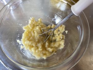 3、ボウルにバナナ1本を入れ、潰す。