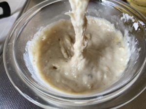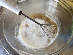 4、潰したバナナに、砂糖・牛乳(豆乳代用可)・オリーブオイルを入れ、よく混ぜる。