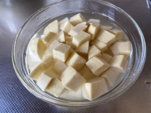 2、さつまいもを角切りにして、水にさらしておく。