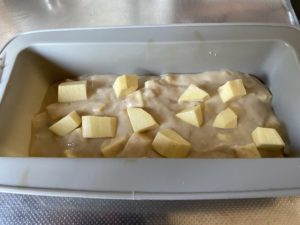 6、角切りしたさつまいもを生地に入れ混ぜ、型に流し込む。