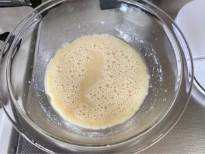 ③ ボウルにこめ油・砂糖・豆乳を入れ、泡だて器でよく混ぜる。
