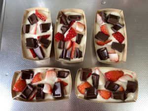 ⑥ 型に生地を流し入れ、いちごと割ったチョコをトッピングする
