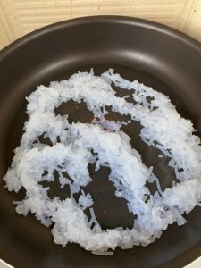 プライパンに細かく刻んだ糸こんにゃくを入れて、水気が飛ぶまで炒めてください。